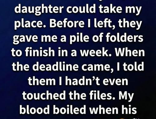 When the following Friday came, he returned to the office with the folders exactly as they had been. Calmly, he told his manager that he had not completed the reports and felt it would be more appropriate for the new employee to handle them. Unexpectedly, the manager’s daughter stepped forward and explained that she had already finished the work herself.