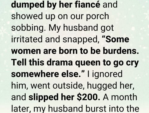 She could barely stand. One hand clutched the railing for support, while the other rested on her belly. Her face was flushed from crying, her expression distant—as if she had been wandering aimlessly before ending up at our house.