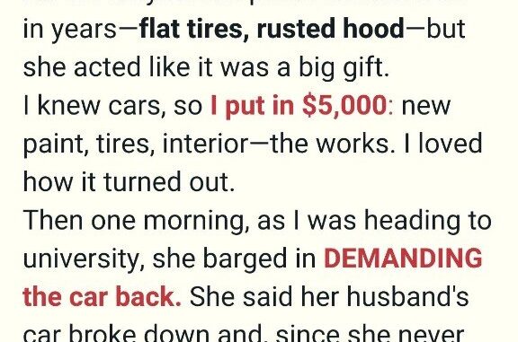 “My husband’s car broke down,” she explained, “so we need yours. And technically, it’s still mine—I never transferred the title.”