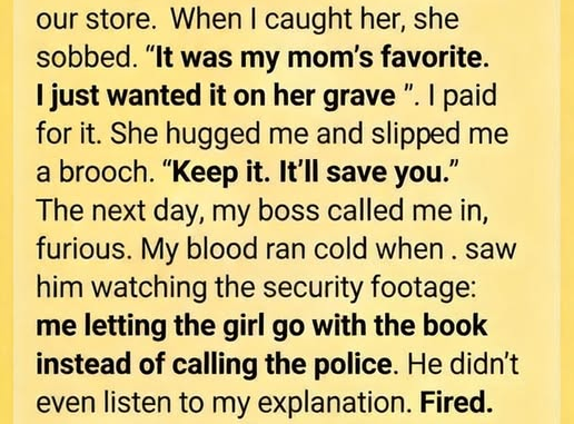 Losing the bookstore felt like losing a safe place I could always return to. For days, I replayed the security footage in my mind, questioning whether my compassion had cost me too much. The box I carried felt heavy—not just with items, but with doubt. Yet the silver flower brooch on my jacket didn’t feel like a reminder of failure; it felt like a quiet sign that the moment mattered.