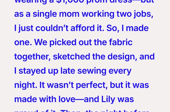 My daughter Lily dreamed of a $1,000 prom dress, but as a single mom juggling two jobs, I couldn’t afford it. When she showed me the dress on her phone, she didn’t beg—she just hoped. That weekend, I decided: if I couldn’t buy it, I would make it. Together we picked fabrics, sketched designs, and I spent nights sewing it stitch by stitch. It wasn’t just a dress—it was proof of love.