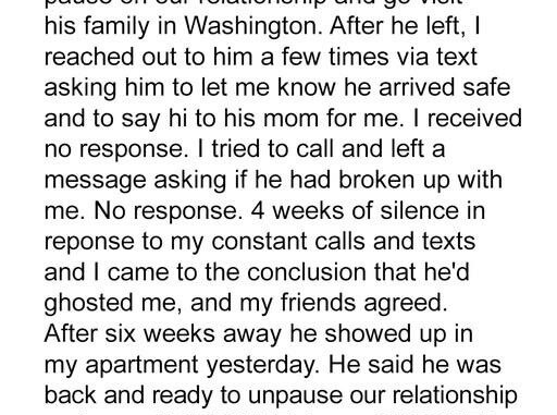 I told him I didn’t really understand how a relationship could just be paused, but he seemed firm that it was what he needed.