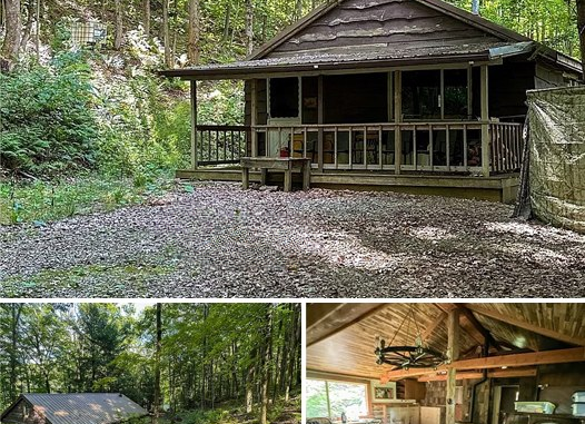 Important updates have already been made to support future renovations. French drains help control water around the home, and sections of the floor structure have been strengthened, creating a more secure base for rebuilding. An existing outhouse further highlights the property’s potential for off-grid or minimalist living.
