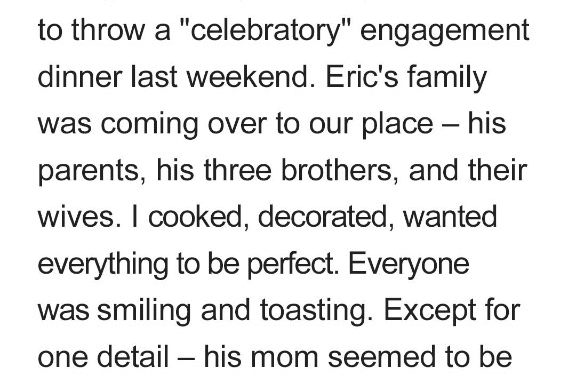 So when we decided to host an engagement dinner for his family, I wanted it to be perfect. I cooked, cleaned, printed custom menus — anything to make a good impression. The evening was going smoothly until his mother, Martha, stood after dessert and said, “You can only marry my son if you pass the family wife test.”