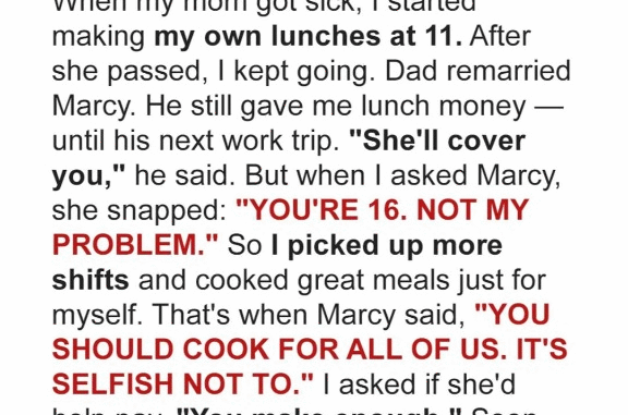When my dad left for a two-week work trip, he reassured me that my stepmom, Marcy, would take care of my lunch money. But the next morning, when I asked her, she snapped, “Not my problem.” Those words hit me hard. I was sixteen, but I’d been cooking for myself since I was eleven, after my mom passed away. Back then, it was just Dad and me, quietly navigating our grief. The kitchen became my refuge, a place where I could make simple meals while the house felt heavy and still.