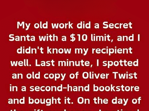 One Christmas at the office, we did our usual Secret Santa, $10 limit. I drew Claire, a quiet coworker I barely knew. Wanting something thoughtful, I wandered into a secondhand bookstore and found a worn copy of Oliver Twist with an inscription: “To my darling Claire — Christmas 1998.” The price? Exactly $10. It felt meant to be.
