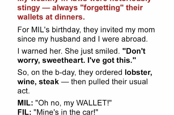 As expected, they performed their usual routine. Then, my mom quietly called over the manager — who turned out to be a former student — and explained the situation. Together, they arranged for the in-laws to be summoned back. Flustered and embarrassed, my in-laws paid the $1,500 bill without a word.