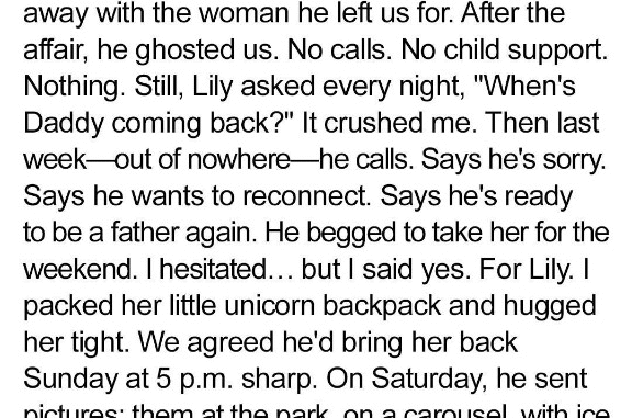 When my ex-husband Leo called to say he wanted to reconnect with our daughter Lily, I felt a flicker of hope. It had been three years of missed birthdays and unanswered calls, and I wanted to believe he had changed. I packed her bag for the weekend—snacks, pajamas, her favorite teddy bear—and sent her off, trusting him.