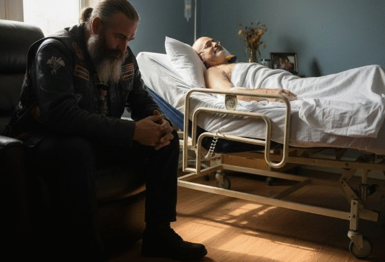 One afternoon, the door opened and in walked a tall, tattooed man in a worn leather vest and dusty boots—someone who looked more at home at a motorcycle rally than in a hospice. He scanned the room, spotted the medals on my table, and immediately straightened up and saluted.