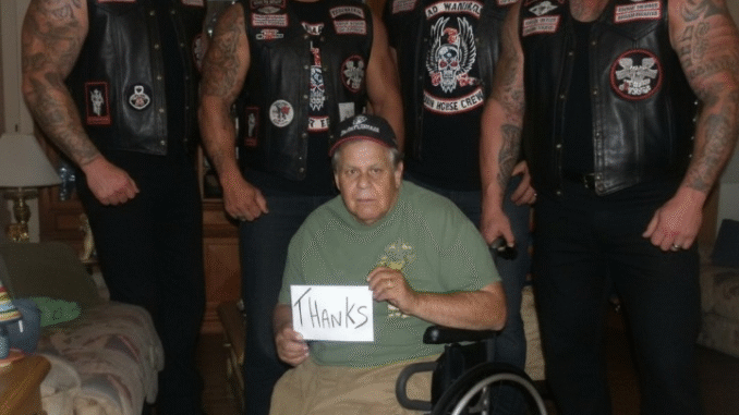 Three more bikers stepped in behind him—older guys with faded tattoos, gray hair, and the heavy presence of men who’d lived through things most people never experience. They were my father’s age. Veterans. Brothers.