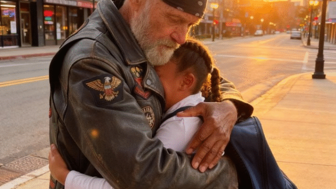Every morning at 7 AM sharp, I roll my motorcycle to a stop a few houses down from the small blue home where eight-year-old Keisha lives with her grandmother. The engine barely cools before the front door swings open and she comes sprinting out, backpack bouncing, braids flying, yelling “Daddy Mike!” like I’m the best part of her day. Her grandmother stands behind her, one hand on the doorframe, watching with tired but grateful eyes. She knows exactly who I am—and who I’m not. I’m not Keisha’s biological father. I’m not a relative. I’m not a man who planned on having children at all. I’m just the biker who found a terrified little girl on the worst day of her life and refused to walk away afterward.