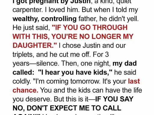 When I was twenty-five, my father gave me an ultimatum: “If you go through with this, you’re no longer my daughter.” I was pregnant and in love with Lucas, a kind-hearted carpenter. To him, Lucas’s lack of wealth made him unacceptable. That night, I walked out, leaving my childhood home behind to build a life from scratch.