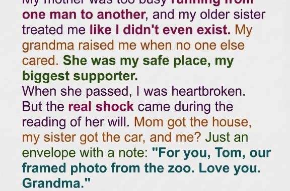 When my grandmother Grace passed away, I expected her will to reflect the bond we shared. She had raised me from age six, providing stability and love in a childhood that often lacked both. So when the family gathered, I was shocked: my mother received the house, my sister the car, and I was left with only a framed photo of us at the zoo.