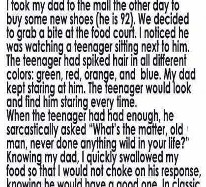 A teenager at the next table, expecting a lecture or insult, froze. Dad wasn’t angry—he was telling a story, layered with decades of experience. “Wildness,” he continued, “isn’t hair, piercings, or loud clothes. It’s quiet sometimes—the courage to take risks most avoid. When I was your age, I left home with twenty dollars, a broken suitcase, and determination. I slept in train stations, shoveled coal, washed dishes. I made friends I miss every day.”