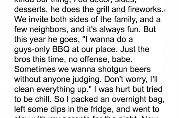 So when he casually suggested hosting a “guys-only” barbecue this year, I was stunned. I packed a small bag and went to my parents’ house, leaving behind a few of my homemade dishes as a silent peace offering. At first, I tried to rationalize it: traditions evolve, compromise is part of marriage. But when a neighbor sent me a photo of our backyard crowded with strangers, including women I didn’t know, I felt blindsided—not by who was there, but by the exclusion and lack of communication.