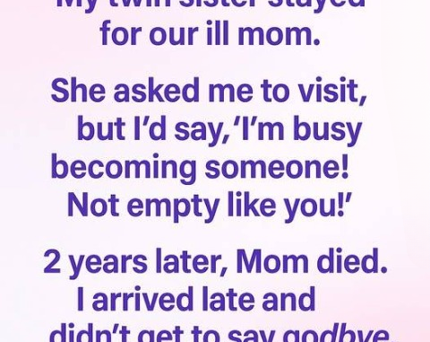 When Mom passed two years later, I arrived too late to say goodbye. Seeing my sister, I realized the cost she had carried alone—exhaustion, grief, and unwavering devotion. She didn’t resent me; she simply whispered, “I stayed because I was full—full of love.”