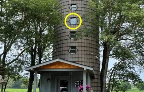 Inspired by a nearby old silo, Gerald transformed it into a four-story, 45-foot-tall living space. The silo features a circular living room with leather chairs, a stone-framed gas fireplace, a flat-screen TV, and a cleverly tucked half bathroom. Guests ascend winding stairs to reach the master bedroom on the fourth floor, making the journey as memorable as the stay itself.