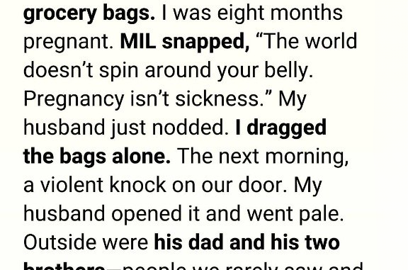 Then, the next morning, a violent knock at the door broke the silence. My father-in-law stood there, flanked by my husband’s brothers. Calm but firm, he said: