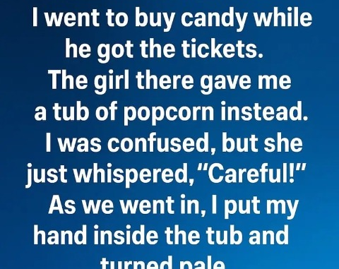 Her voice was low, urgent, and strangely cold. A chill ran down my spine, and I felt a sudden knot of unease tighten in my stomach. I thanked her quickly, forcing a smile, and clutched the popcorn tightly as I walked to meet him.