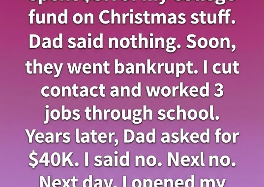 While I carefully saved for college and dreamed of independence, my stepmother treated my education fund like a holiday account—thousands vanished on gifts, decorations, and celebrations that looked lavish but left nothing lasting. My father knew. He always knew. Yet he stayed silent, choosing peace in his marriage over responsibility to me. When everything collapsed and bankruptcy followed, I wasn’t shocked—just weary. I walked away, not from anger, but from necessity, learning early that if I wanted stability, I’d have to build it myself.