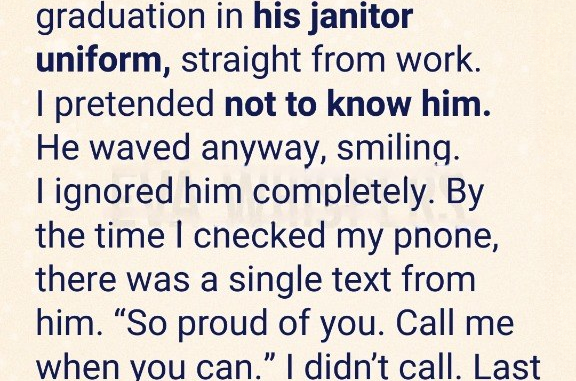 My father came to my graduation straight from work, still in his janitor uniform. Among parents in crisp clothes and flowers, he looked out of place. When he saw me, his face lit up, and he waved awkwardly, full of pride. I looked away, embarrassed by his work, and didn’t acknowledge him as I walked across the stage.