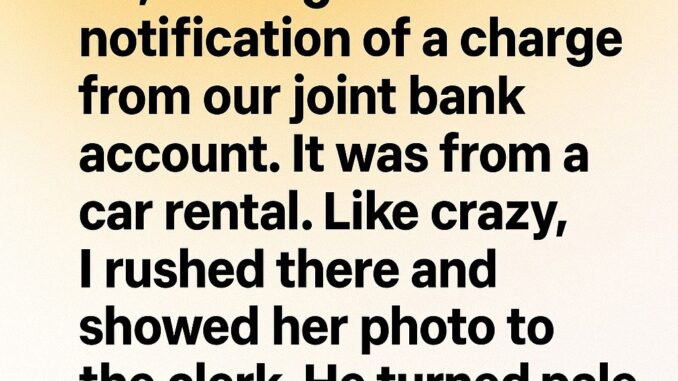 Eight days after my wife’s funeral, a routine bank alert shattered my fragile sense of reality: a charge for a car rental, made in her name. Panic surged. Logic refused to catch up. I drove straight to the rental office, armed with her photo, desperate for an explanation—some bureaucratic mistake, some delayed transaction that would restore order.