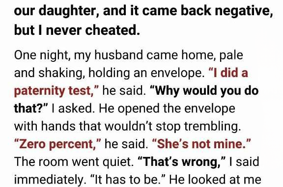 The doctor explained that bone marrow transplants can permanently alter a person’s DNA in blood and saliva. The test hadn’t been matching Lily to my husband’s original DNA—it had been matching her to his donor’s.