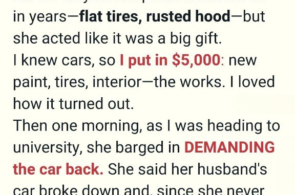 Then one morning, my sister barged into my apartment without knocking. “I need the car back,” she demanded. “My husband’s car broke down, and technically it’s still mine. I never transferred the title.”