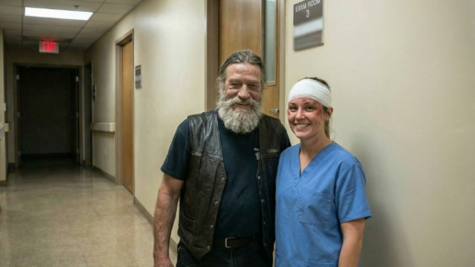 A biker jumped off, tore my attacker away, and sent him running. He stayed calm, called the police and security, wrapped his jacket around me, and didn’t leave. His name was Marcus—gray-bearded, rough-looking, and quietly gentle.