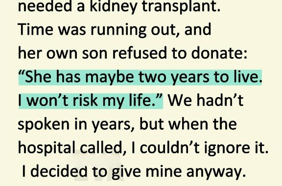 That’s what they told me when I woke—sore, disoriented, my body feeling unfamiliar. They said her recovery looked promising. They said the kidney was working. They said I had saved her life.