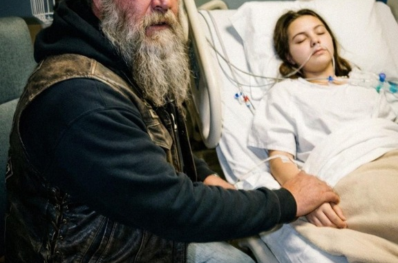 For six months, a biker came to my daughter Hannah’s hospital room every day at 3 p.m., quietly holding her hand, reading to her, and leaving without a word to me. I didn’t know who he was—until one day I followed him into the hallway.