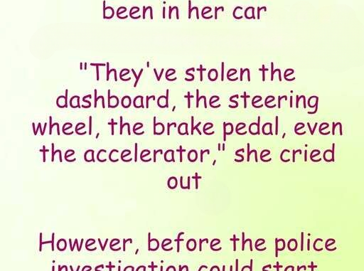 “My car’s been robbed!” she cried. “They took everything—my steering wheel, the dashboard, the pedals, even the gas pedal! There’s nothing left!”