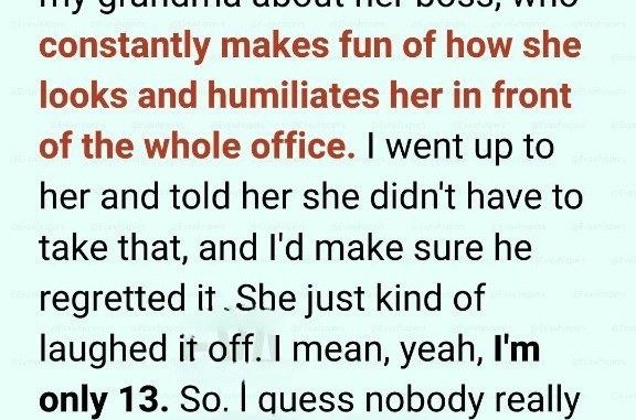 That night, I went to her room. I told her she didn’t have to tolerate that, that no one had the right to humiliate her. I promised I’d make sure he regretted it.