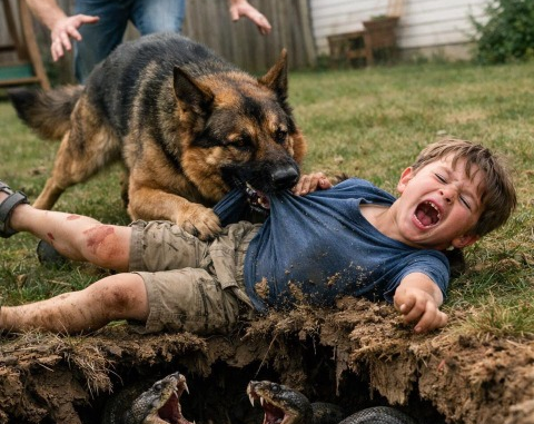 Titan had his jaws locked onto the back of Caleb’s shirt, dragging him across the grass in urgent, forceful pulls. Caleb was crying, confused, scraping his hands along the lawn.