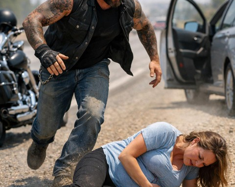 On a scorching afternoon along Missouri’s Highway 17, what looked like a cinematic rescue unfolded in raw, terrifying reality. For nearly half an hour, drivers sped past the same scene: a broad-shouldered man on a weathered Harley-Davidson, engine idling, sweat dripping from his brow. His name was Dylan Cross, and most people didn’t notice him—just tattoos, leather, and boots. Inside their air-conditioned cars, they made a silent choice: don’t stop.